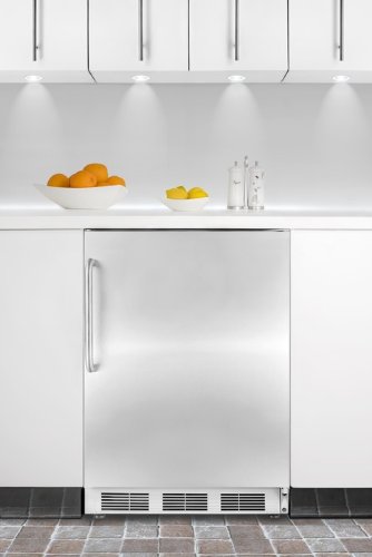 There are many good reviews about this ice maker. Most customers feel happy with the quality of this portable ice maker. There are three main ice cube sizes that are available, including small, medium, and also large. .Summit FF7BISSTBADA: ADA compliant commercial built-in auto defrost all-refrigerator with white cabinet, stainless steel door, and towel bar handle will help your job easier dexCommercially approved for use in foodservice establishments. 32" height allows installation under lower ADA compliant counters. Flexible design allows built-in or freestanding use in 24" spaces. Automatic defrost ensures minimum user maintenance. Stainless steel wrapped door with professional towel bar handle adds luxury to any setting. Seamless interior for easier cleanup. Full 5.5 cu.ft. capacity inside a convenient 24" footprint. Made in Europe. Dimensions: 32" H x 23.63" W x 23.5" D. AccuCold by Summit Appliance offers a wide range of all-refrigerators for general purpose storage. The commercially listed FF7BIADA Series features 24" wide all-refrigerators designed for built-in installation under lower ADA compliant counters. The FF7BISSTBADA is a 32" high all-refrigerator with a full 5.5 cu.ft. capacity inside a slim 24" footprint. The front-breathing design allows built-in use under counters, while the fully finished cabinet also lets this unit be used freestanding. This model has a white cabinet and stainless steel wrapped door. A curved towel bar handle in brushed stainless steel completes the professional look. Inside, the FF7BISSTBADA utilizes low maintenance automatic defrost operation. Our unique "hidden" evaporator is set behind the rear wall to create a seamless, easy-to-clean interior that also maximizes shelf space. This unit has a flat door liner that allows it to accept larger trays (up to 19 1/2" x 16"). Adjustable wire shelves allow users to reconfigure the interior to accommodate a variety of sizes. The interior light is controlled by an on/off rocker switch located behind the thermostat dial. The FF7BISSTBADA is ETL-S listed to NSF-7 standards for use in commercial establishments. For more finish options, browse the entire FF7BIADA Series. NOTE: This unit is designed for general purpose, medical, or commercial applications and does not meet DOE energy standards for residential use.